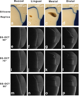 接着修復の際、窩縁部のエナメル質には応力が集中し亀裂が生じることがある。これらの亀裂は従来の観察方法では検出が困難であったため、SS-OCTを用いて三次元的に評価した。光干渉断層像により窩縁部に生じた微細な亀裂を非侵襲的に可視化することが可能となり、接着修復の信頼性評価に新しい手法を提供すると考えられる。